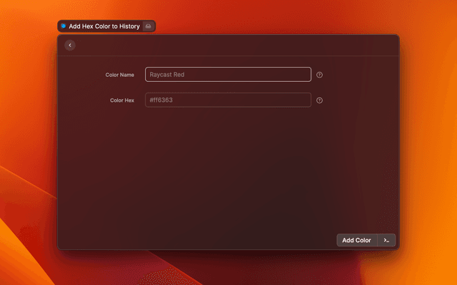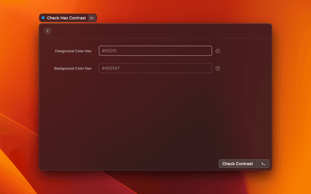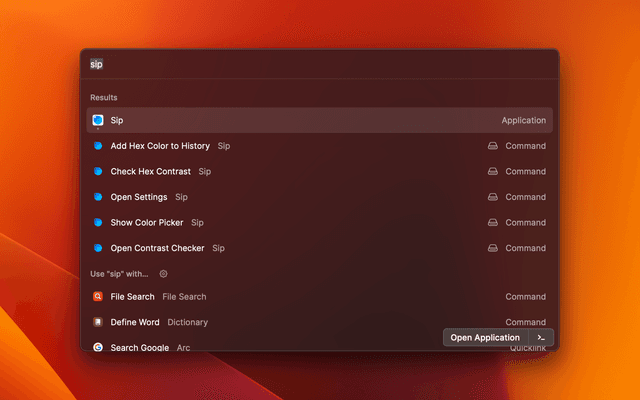Access these Sip color management app features from Raycast: show color picker, open contrast checker, open settings, check contrast between two hex values, and add hex color to history.