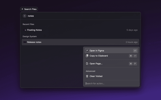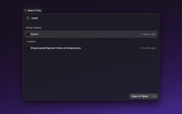 You'll also need a Personal Access Token. To create this, click on your avatar on Figma.com and go to settings. Scroll down to Personal Access Token and create a new one to use with Raycast.